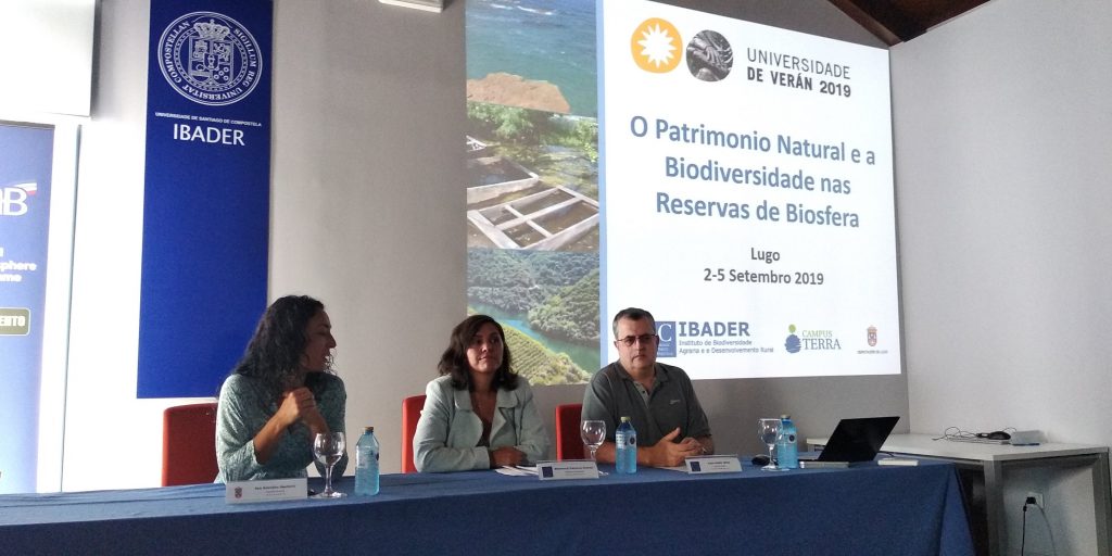 Entre el 2 y el 5 de septiembre de 2019, el IBADER del Campus Terra de la USC organizó el Curso de Verano «EL PATRIMONIO NATURAL Y LA BIODIVERSIDAD EN LAS RESERVAS DE BIOSFERA«. Al acto inaugural acudió Ana González Abelleira, en representación de la Diputación de Lugo, Montserrat Valcárcel en calidad de Vicerrectora de Coordinación del Campus de Lugo, y Pablo Ramil Rego como Director del IBADER. Los objetivos del curso son conocer directamente el patrimonio natural de las Reservas de la Biosfera, tomar conciencia de la importancia y servicios ecosistémicos de estos espacios en relación con la biodiversidad, el paisaje y la calidad de vida, y conocer la planificación, las tendencias y posicionamientos en torno a estos espacios.